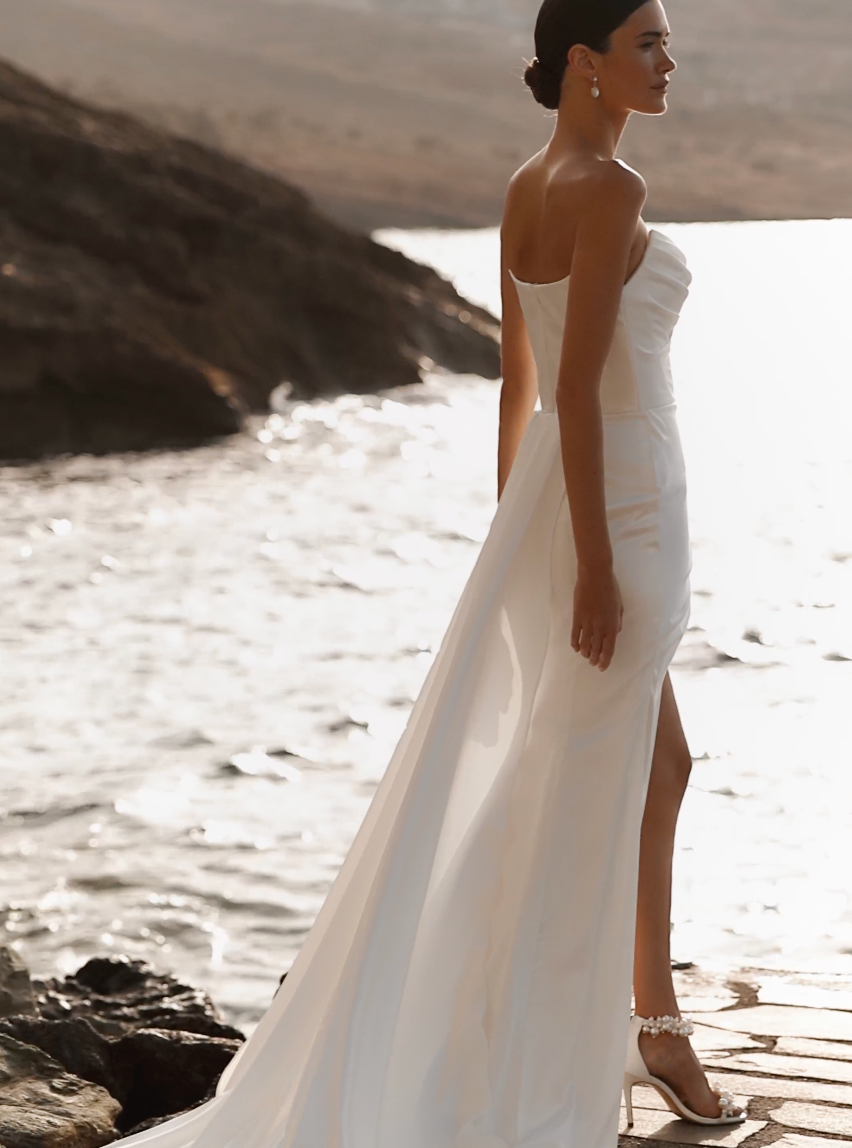 Glamorous and sleek satin A-line wedding gown with elegant draping. The sleeveless design features a structured corset with visible boning, a sharp artfully draped neckline, and a fitted maxi skirt with a daring thigh-high slit. Side draping accentuates the silhouette, leading to a daring side slit and finishing with a subtle train. Can be complimented by a chic satin off-the-shoulder bolero Bellissima with long sleeves. You can also choose a detachable train to extend the dress.