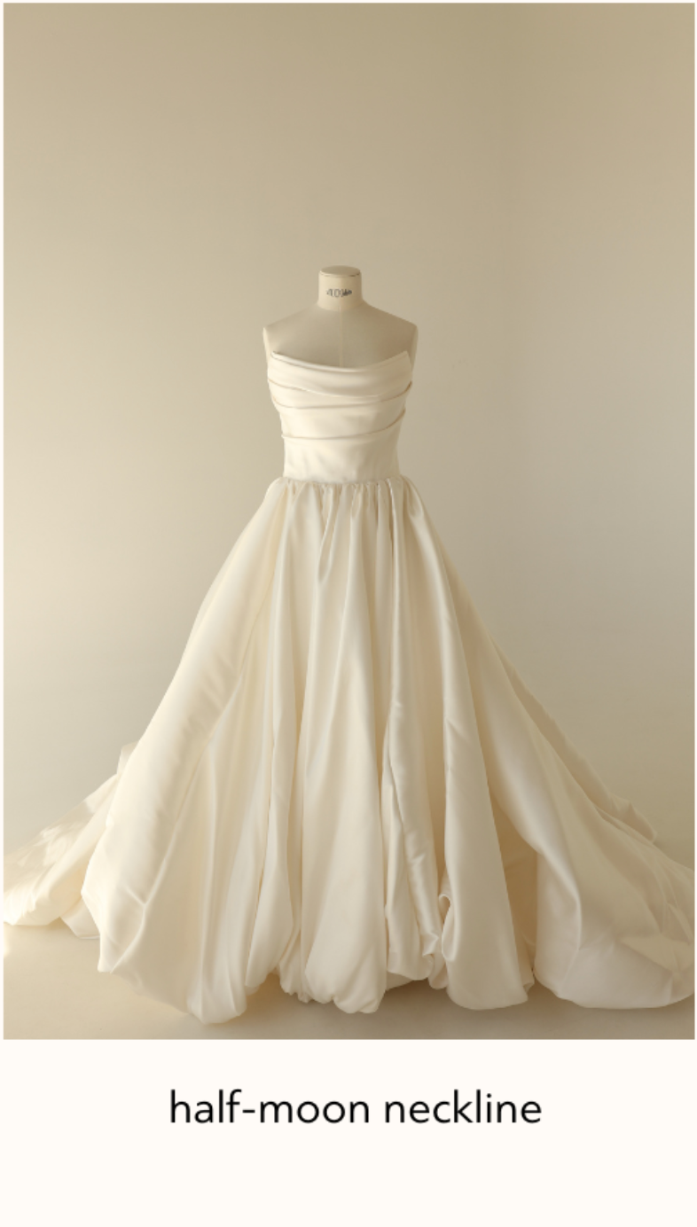 Statement princess wedding gown crafted from luxurious mikado. The fitted, draped bodice accentuates the waist, flowing into a voluminous floor-length skirt with a subtle balloon-like structure for added grandeur. Both lace-up and zipper closure options are available. The gown is paired with volumetric detachable off-the-shoulder sleeves to highlight the shoulder line beautifully. Finish the look with Aveline satin opera gloves and Claire veil.