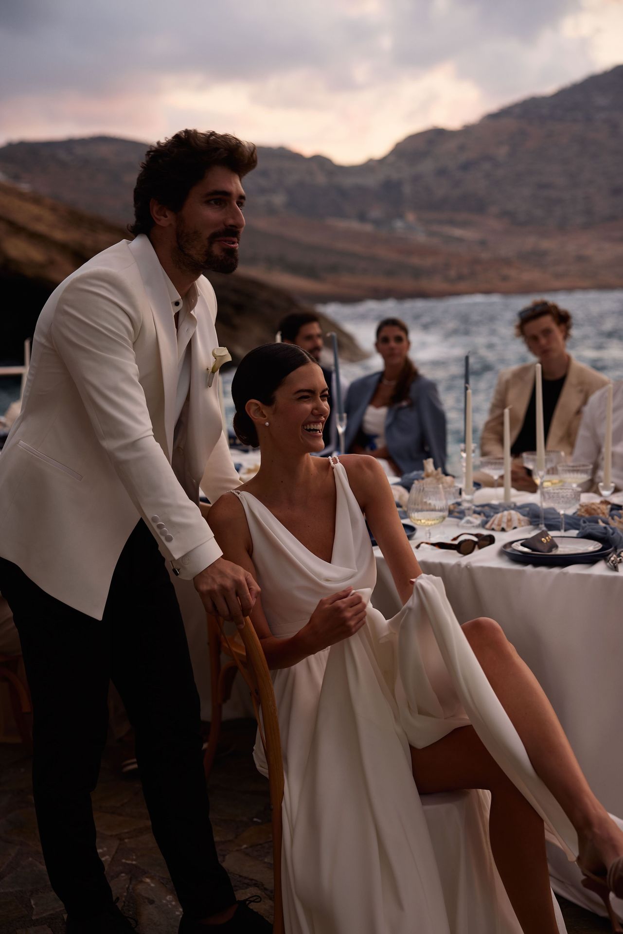 Ethereal A-line chiffon wedding gown with a draped cowl neckline reminiscent of ancient Grecian attire, fitted waist cinched with delicate ruching beautifully enhancing the silhouette, and the flowing A-line skirt cascading gracefully to the floor, creating a goddess-like allure. For added drama, the gown may be styled with an opulent long train. Can be completed with a chiffon Fawna long scarf for additional coverage and an element of airy romance.