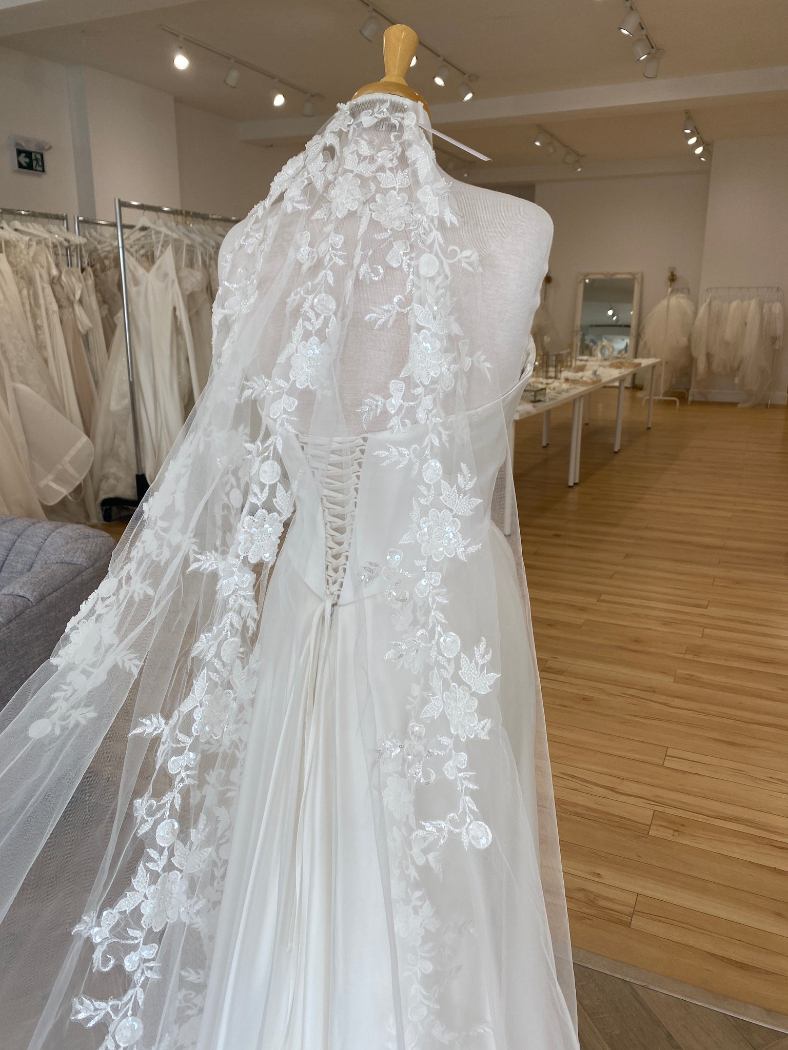 royal-length, single tiered veil, featuring glittering sequin floral appliqué.