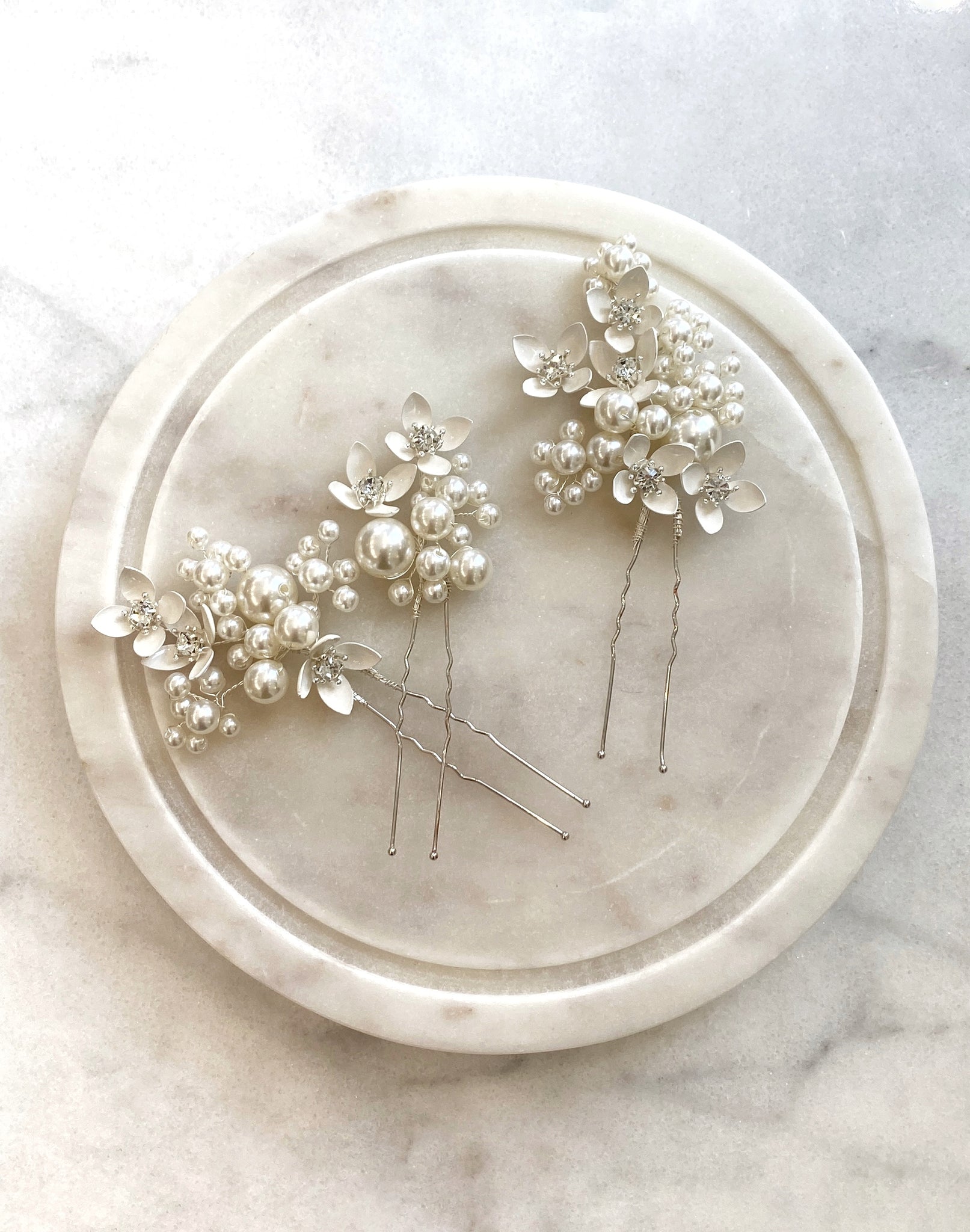 This perfect blend of florals, sparkle, and pearl is the final touch of timeless grace to any bridal look. This set of 3 pins is perfect for a scattered, elegant look, while versatile enough to compliment your personal bridal style.