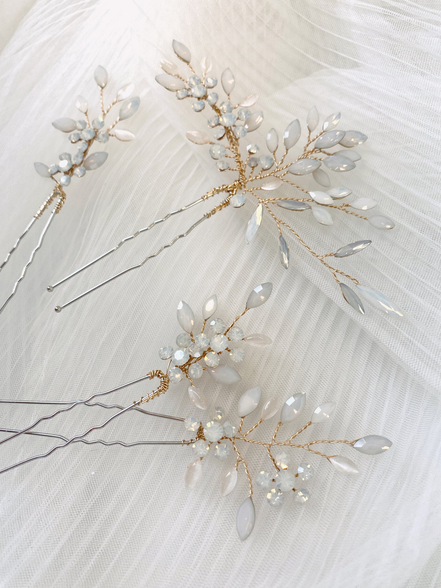 Nature meets dreamy elegance in this 4-piece set. Versatile and whimsical, the crystals are perfect for scattering through a soft bun or accenting glamorous curls. Each stone shimmers like captured sunlight. The variety of shapes and details are exquisitely crafted and can be adjusted to be worn with a veil or alone.