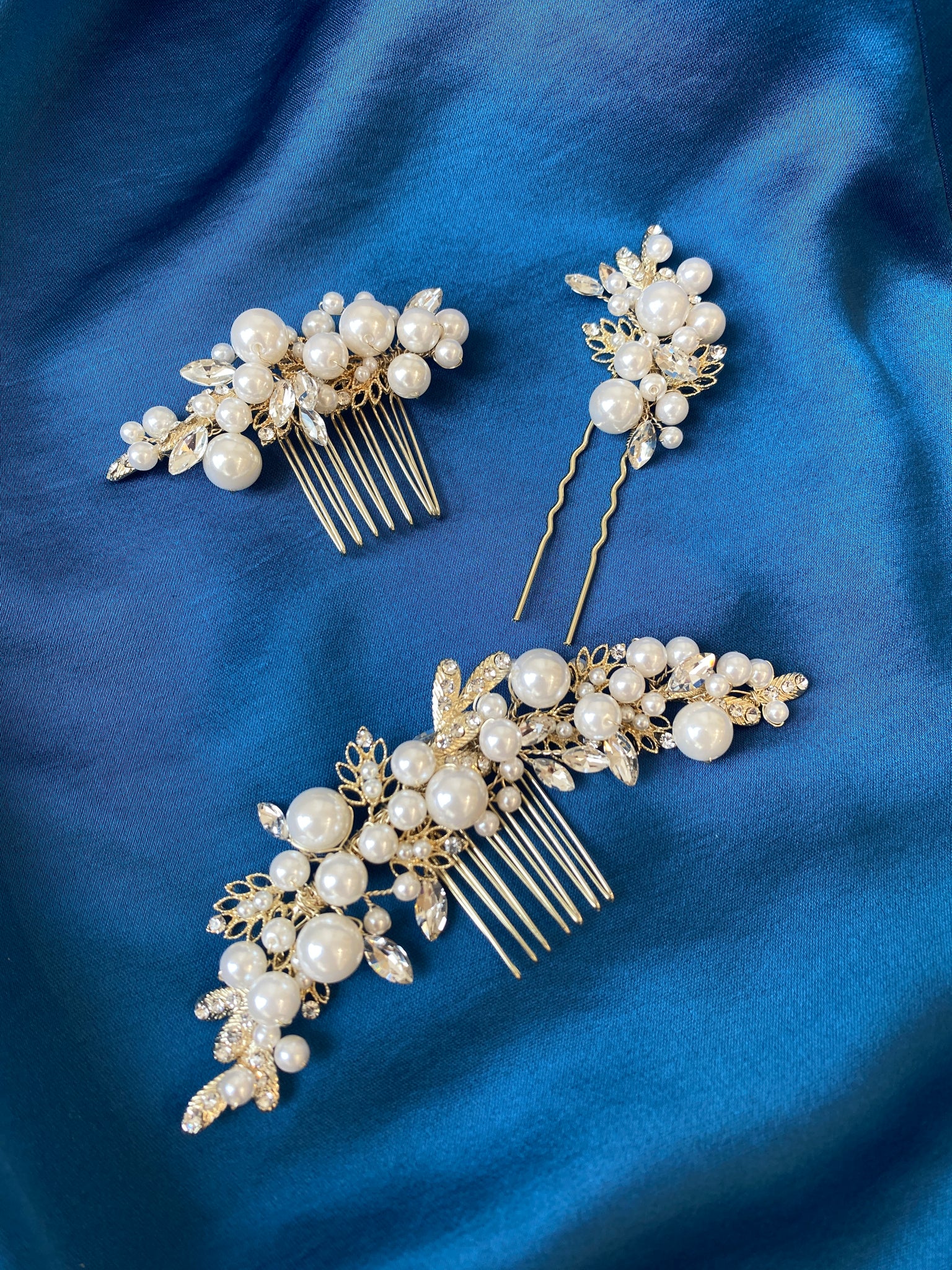 Elegant and romantic, the Gracie Set includes two gold-tone hair combs and one pin featuring delicate leaf and floral designs with shimmering crystal details. Perfect for tucking into an updo, braids, or soft waves, this set adds a natural, graceful sparkle to any bridal look. Whether worn together or separately, Gracie offers effortless beauty with a touch of woodland charm.