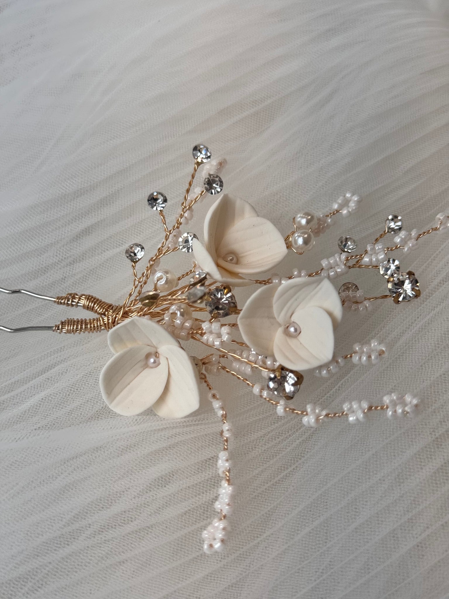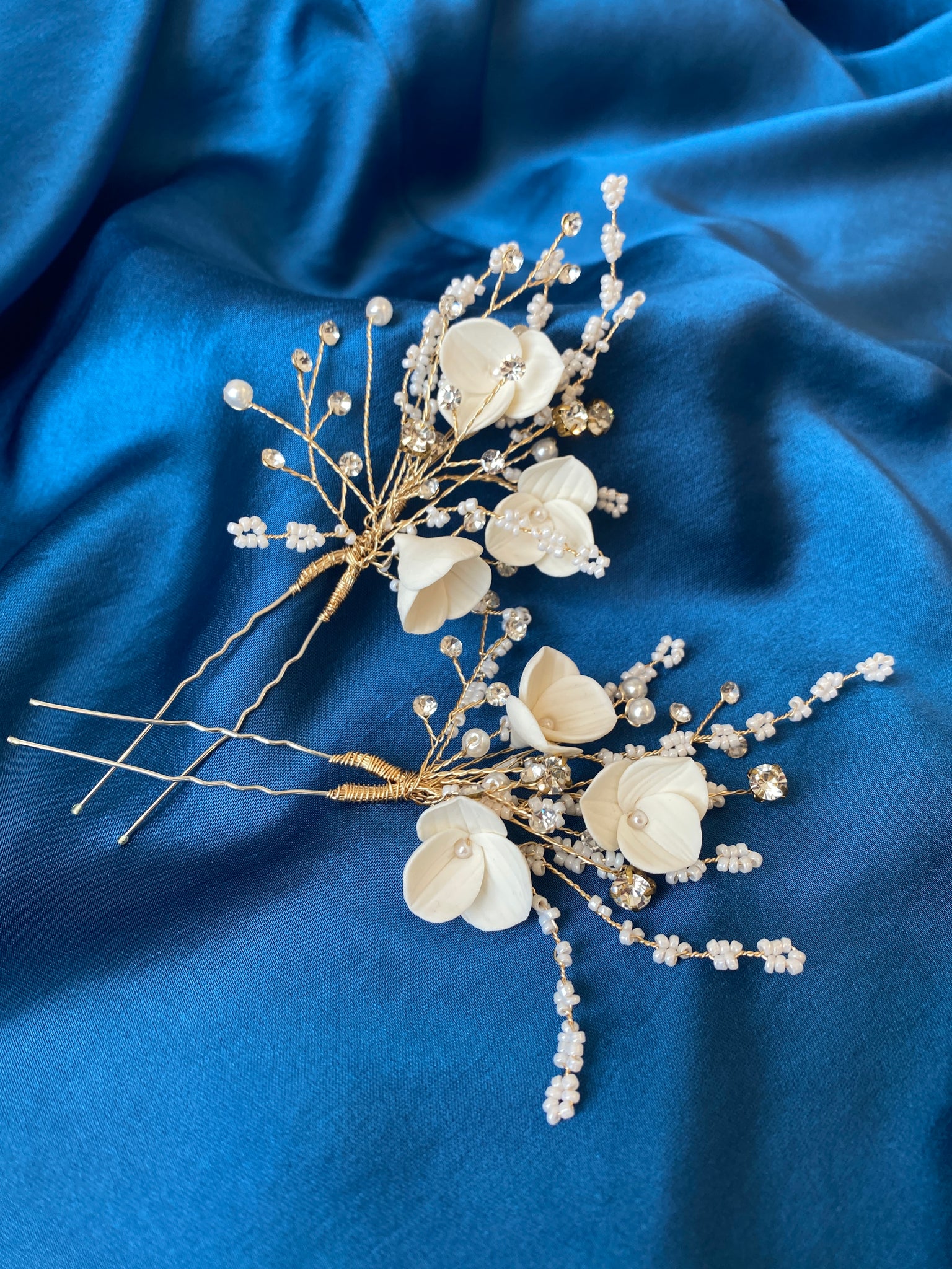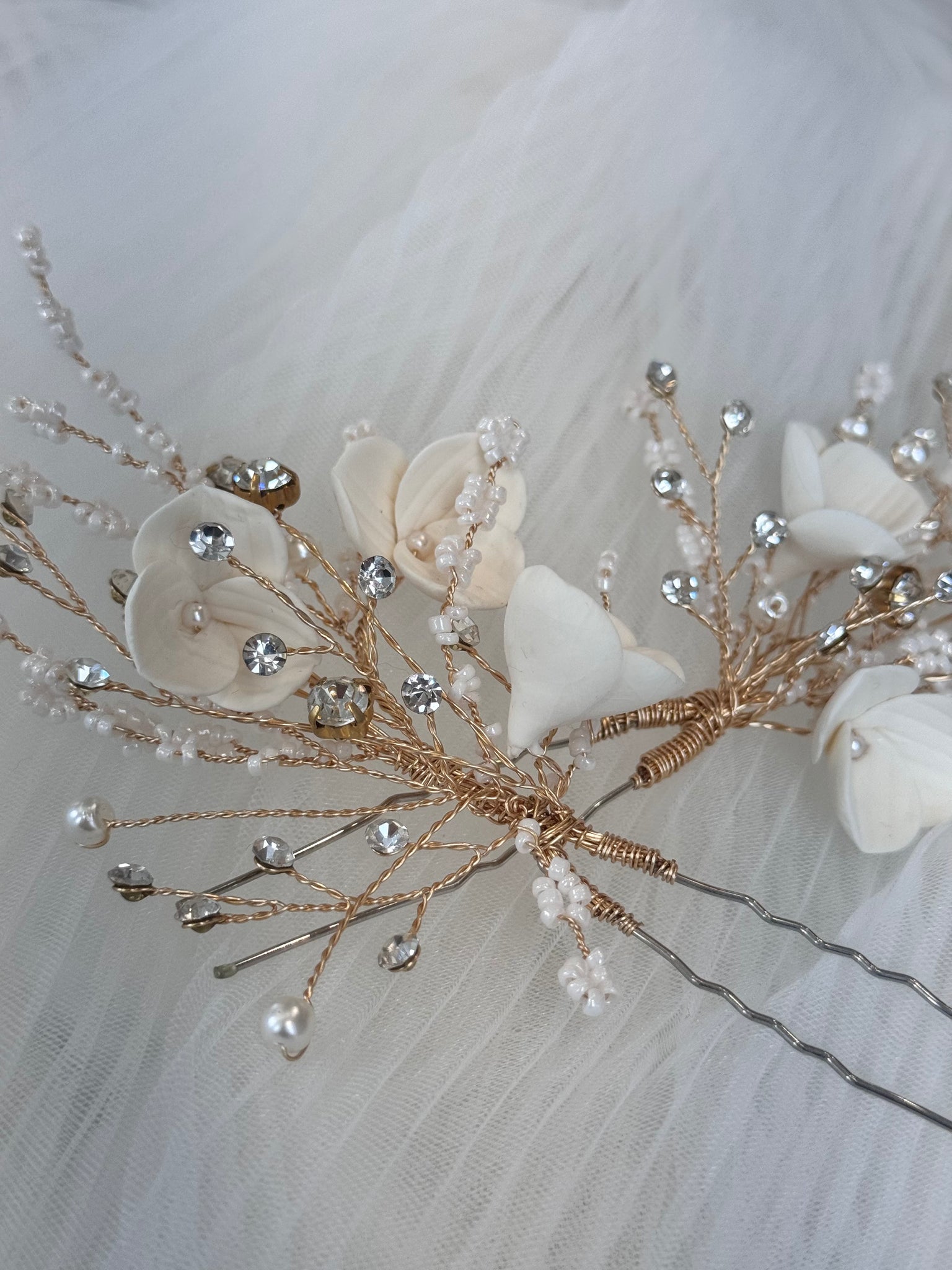 Delicately crafted for the modern romantic, this set of two bridal hair pins features luminous pearls nestled among golden blossoms and intricate branches. Each pin adds a touch of ethereal elegance, perfect for weaving into soft updos, tousled waves, or classic buns. Whether you're walking down the aisle or attending a garden soirée, these timeless accents bring just the right amount of shimmer and sophistication to your look.